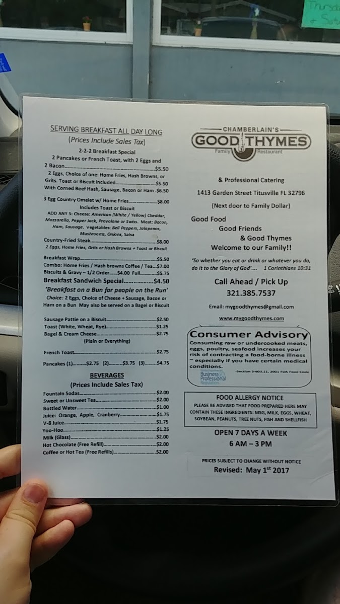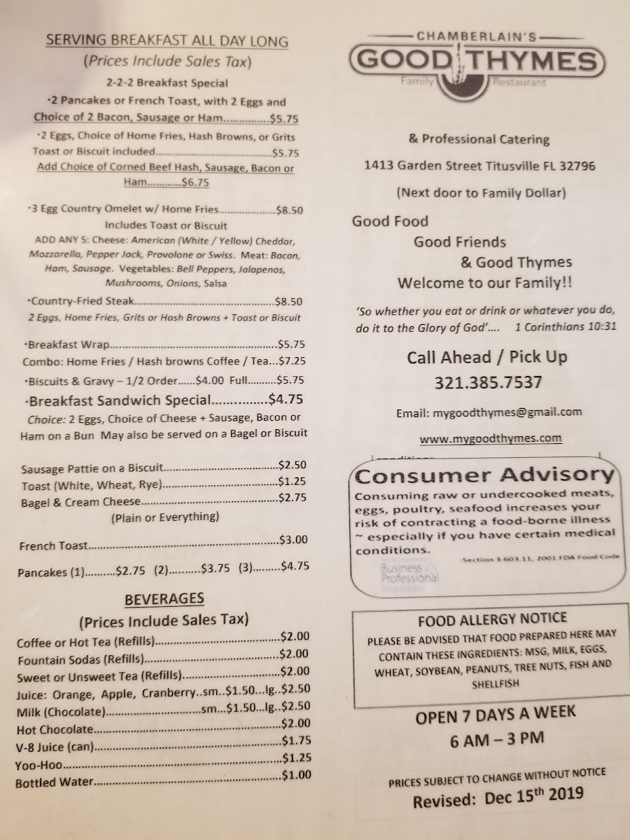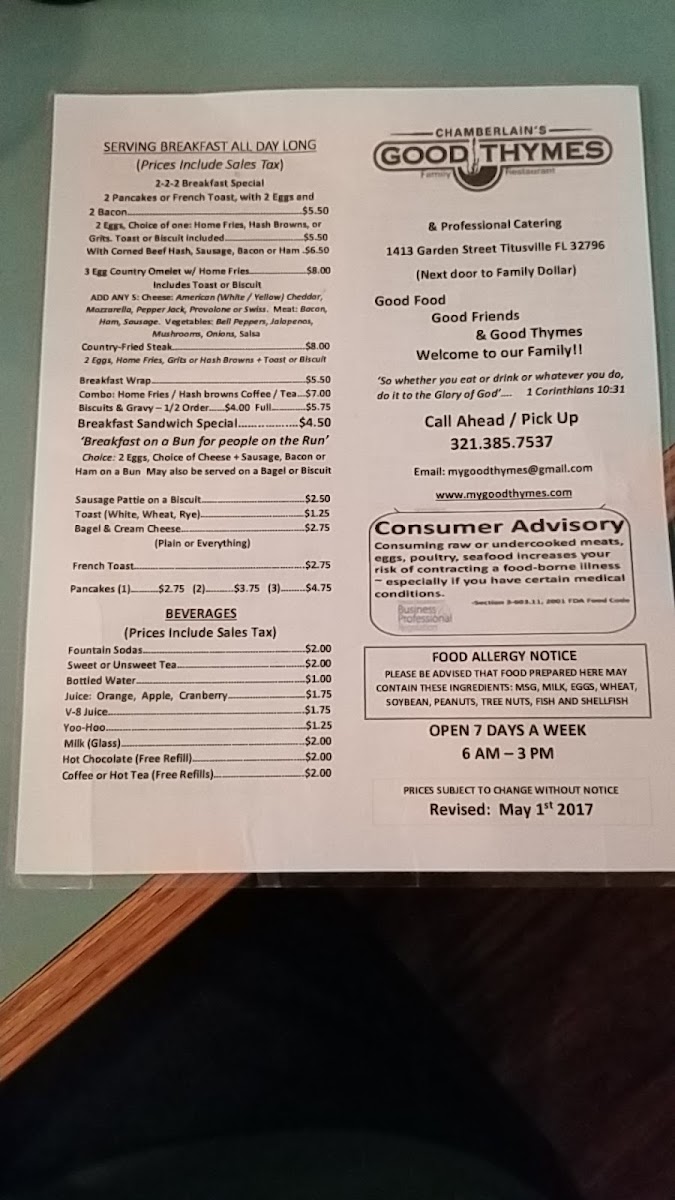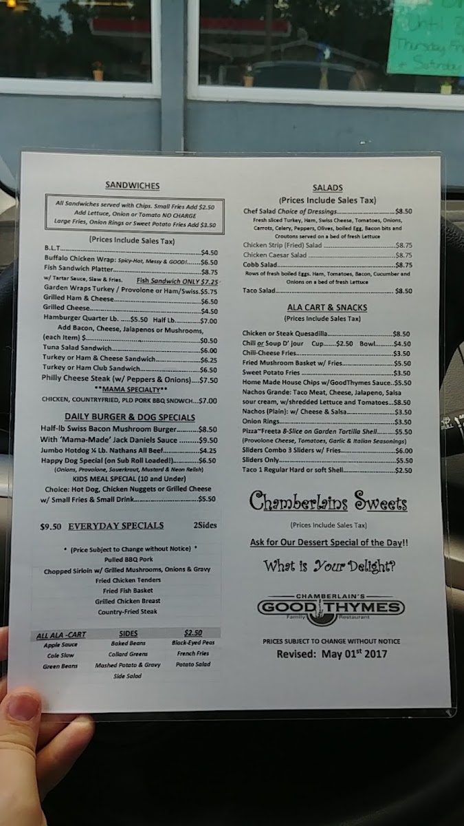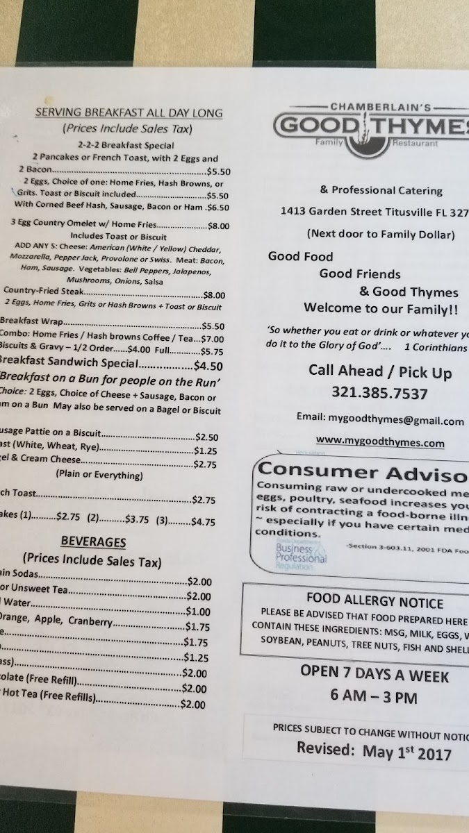 At Chamberlains Good Thymes, located at 1413 Garden St in Titusville, FL, you're in for a delightful culinary experience. The menu offers a perfect blend of comfort food and creative twists on classic dishes. Whether you’re craving a hearty meal or something light and fresh, the selection has something to satisfy every palate. From flavorful appetizers to indulgent mains, each dish is crafted with care and passion. You can enjoy everything from savory meats to fresh seafood, all prepared with high-quality ingredients. If you're looking for a cozy, welcoming atmosphere with delicious food to match, Chamberlains Good Thymes Menu is the place to be.